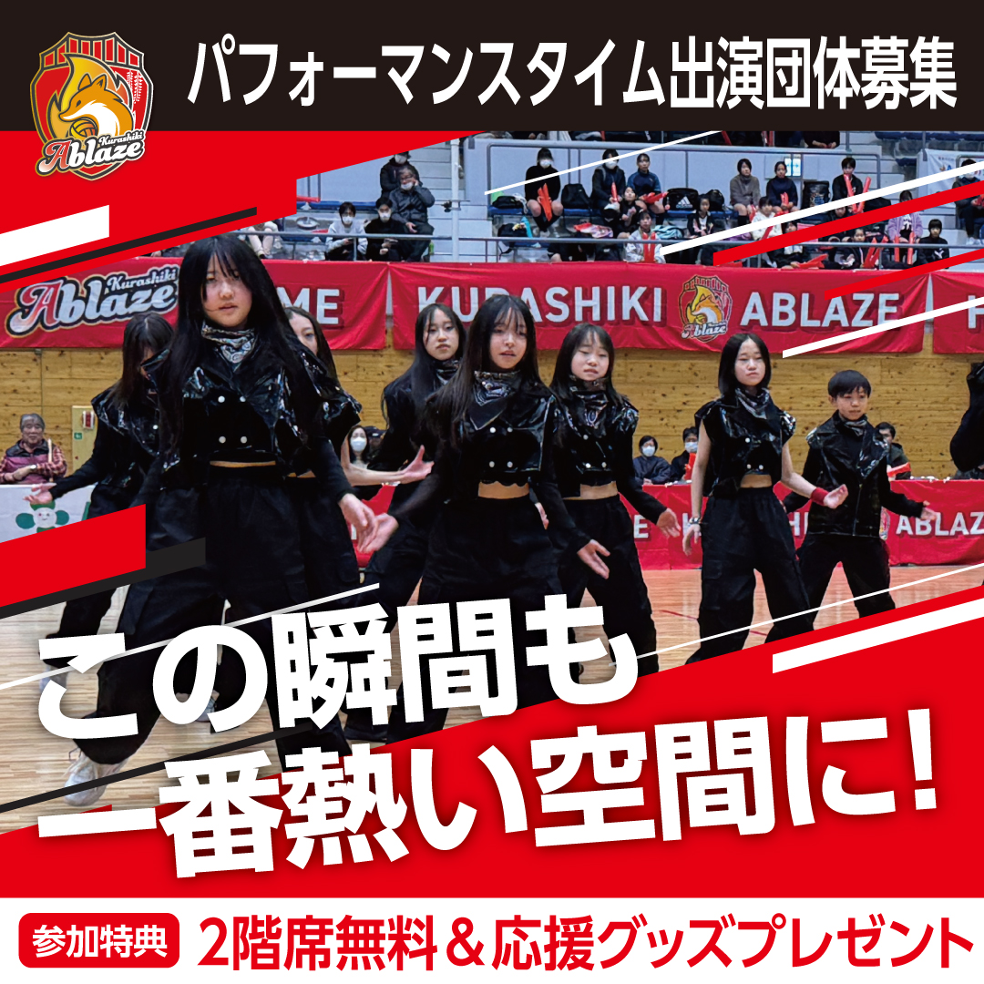 倉敷アブレイズでは、2025-26シーズンのホームゲームを一緒に盛り上げてくださるパフォーマンスタイム出演団体を募集しています。