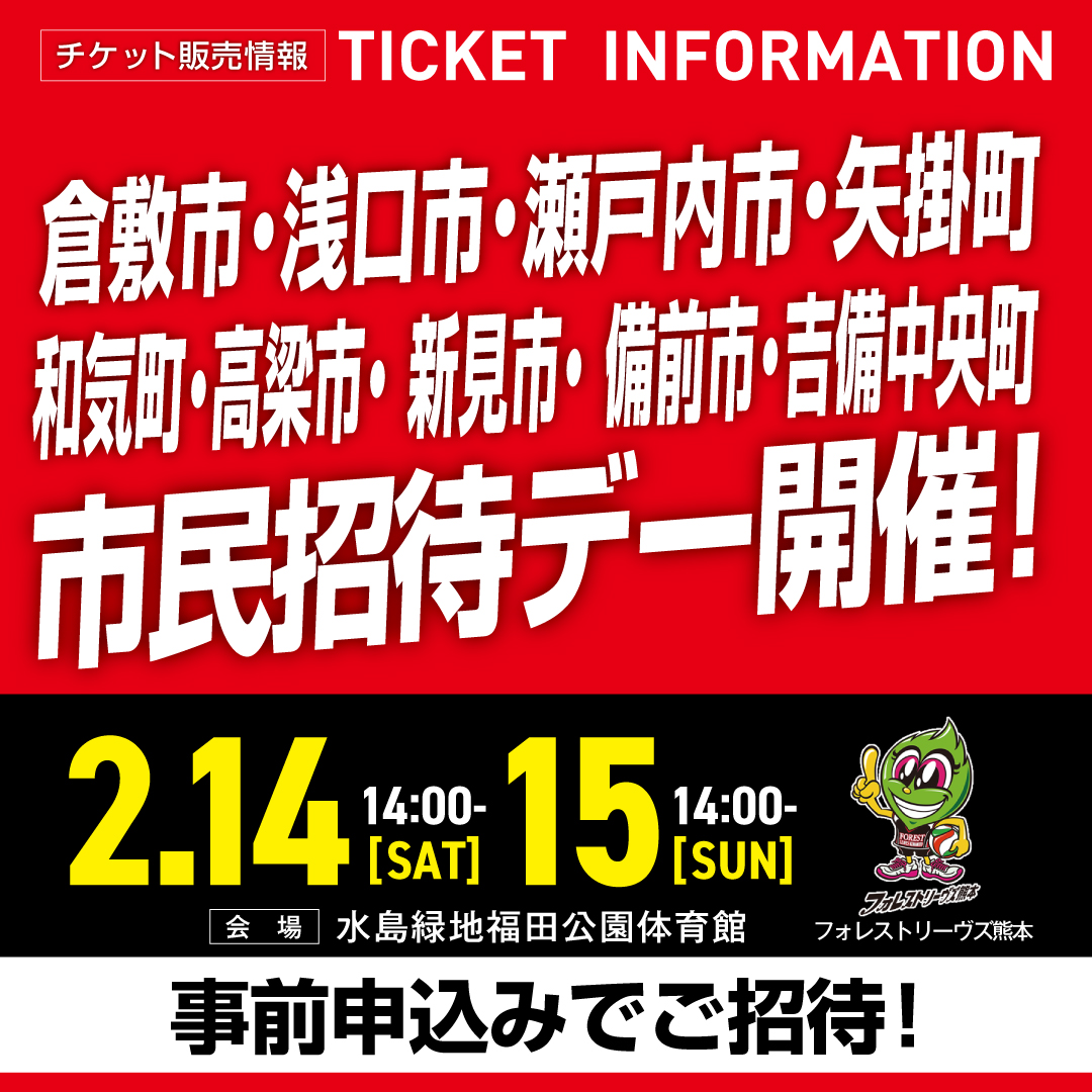 2/14(土)・15(日)のホームゲーム(vsフォレストリーヴズ熊本)は、市民招待デーを実施いたします。